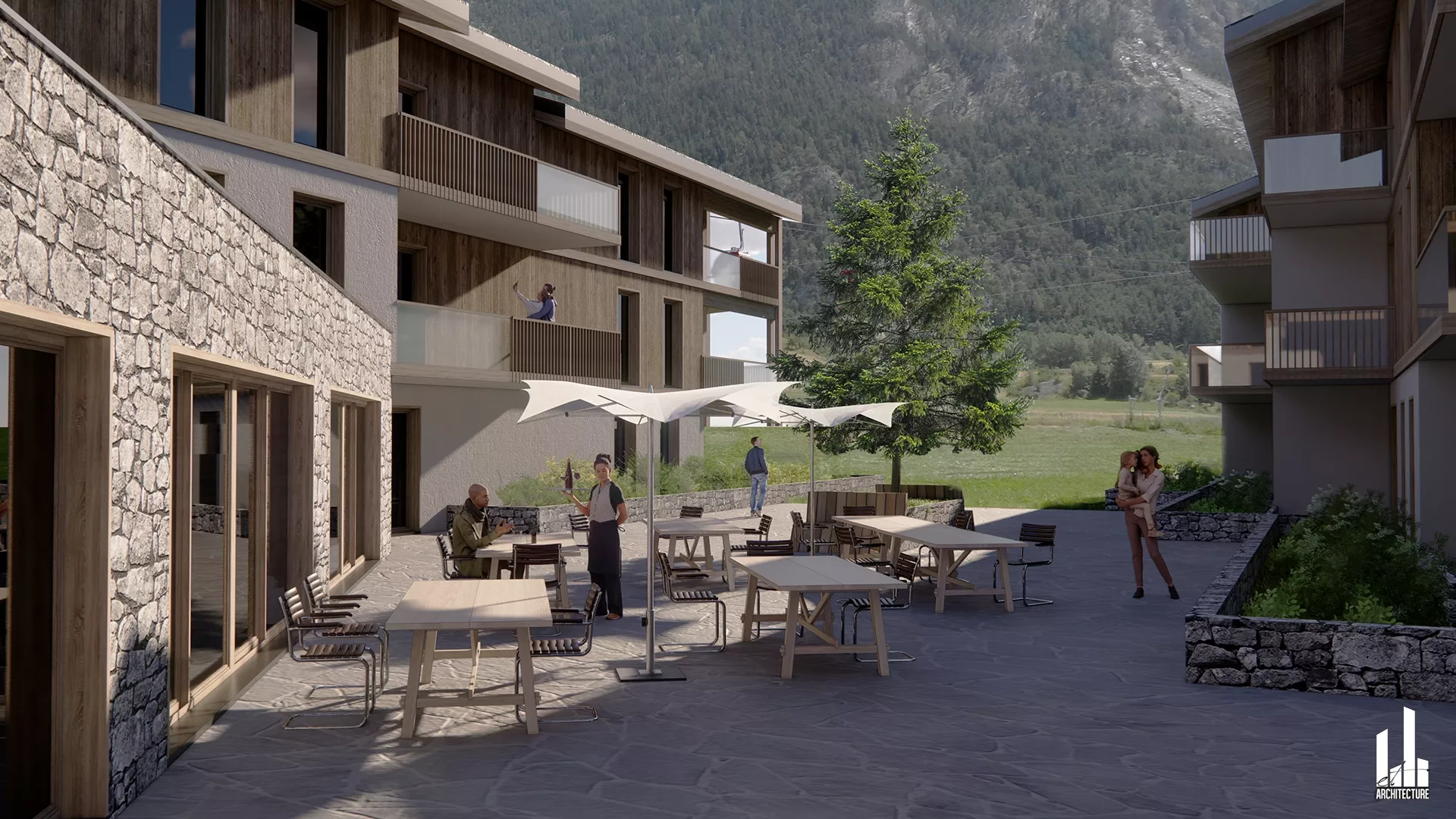 Ce projet d’Hébergement Touristique se situe au pied des pistes, de part et d’autre des remontées mécaniques. Une analyse poussée de la demande et de l’architecture environnante a permis une réponse adaptée au programme et au lieu. Le projet se développe sur deux lignes bâties, centrées autour de l’axe des pistes de ski. Ces lignes sont morcellées pour former un front bâti rappelant celui du bourg. Un socle en pierre fait le lien entre tous les bâtiments et un jeu de toitures rythme l’ensemble.